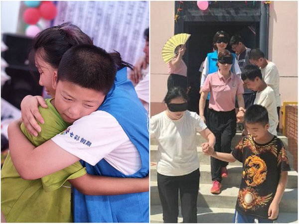 终点处,摘下眼罩的老师和孩子抱在一起。实践团成员抹了把汗,笑着说:“闭着眼的那一刻,才懂孩子的信任有多沉。他们成了我的眼,我们也该成为他们成长的光。” 孩子们仰着头,小脸上满是自豪:“我保护了老师!”。