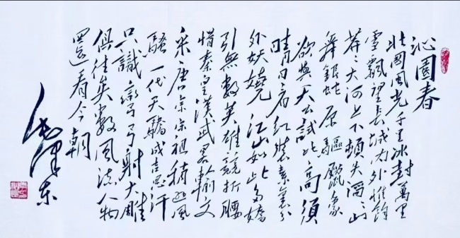 创作实践成果丰硕:他的书画作品多次在全国政协、全国新闻出版界、中直机关及中央电视书画频道等举办的高规格活动中展出并获奖,具有广泛的影响力。其仿毛泽东书法作品尤为出彩,《长征》《满江红》《沁园春》等经典诗词的书法创作,不仅精准还原了毛体书法的雄健气势与独特韵味,更融入了个人对诗词内涵的深刻理解,其中《沁园春·雪》还在2013年中央电视台书画频道迎春活动中展播,让更多人领略到毛体书法的魅力。